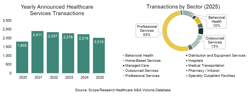 Despite broader declines, certain healthcare sectors saw some growth in M&A activity. Although still below the levels seen immediately following the pandemic, Behavioral Health transactions increased 10.1% over 2024 and remained an active space for investors. The Medical Transport and Pharmacy / Infusion sectors also increased 12.5% and 12.3%, respectively, in 2025 relative to 2024.