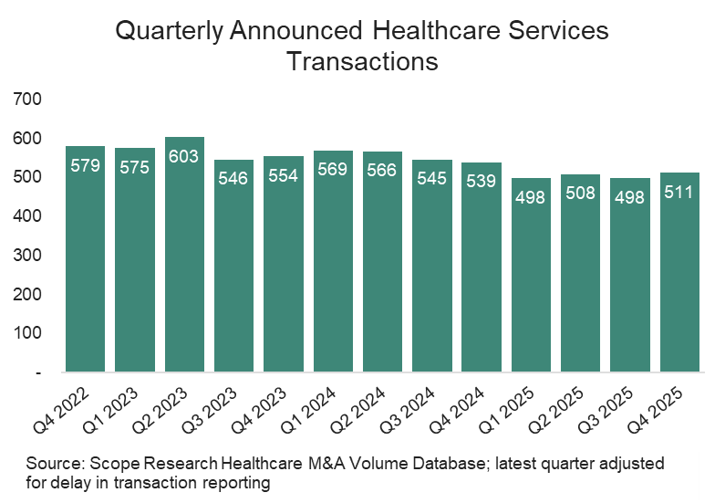 Ankura is pleased to present an overview of healthcare services transactions announced or closed during Q4 2025 in the United States. Total transactions increased by 2.6% in the fourth quarter of 2025 after decreasing by 2.0% in the third quarter. However, compared to Q4 2024, transaction volumes for Q4 2025 were down by 5.2%.