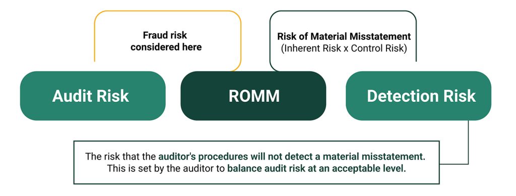 As discussed above, the auditor manages the risk that they fail to identify misstatement — whether due to fraud or error — referred to as “audit risk,” through a simple equation. The interplay of the equation components is important to understanding how fraud risk impacts the overall audit.